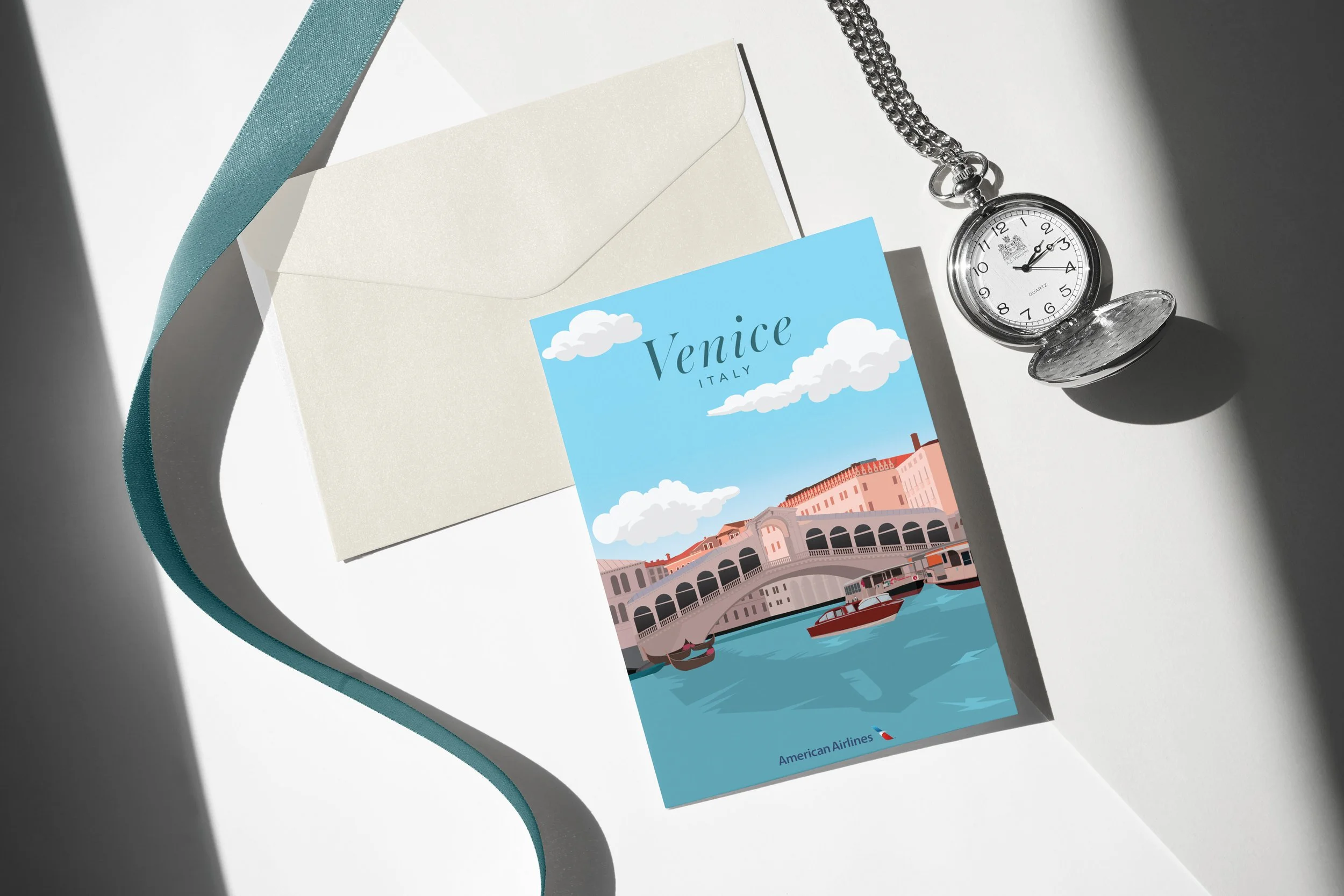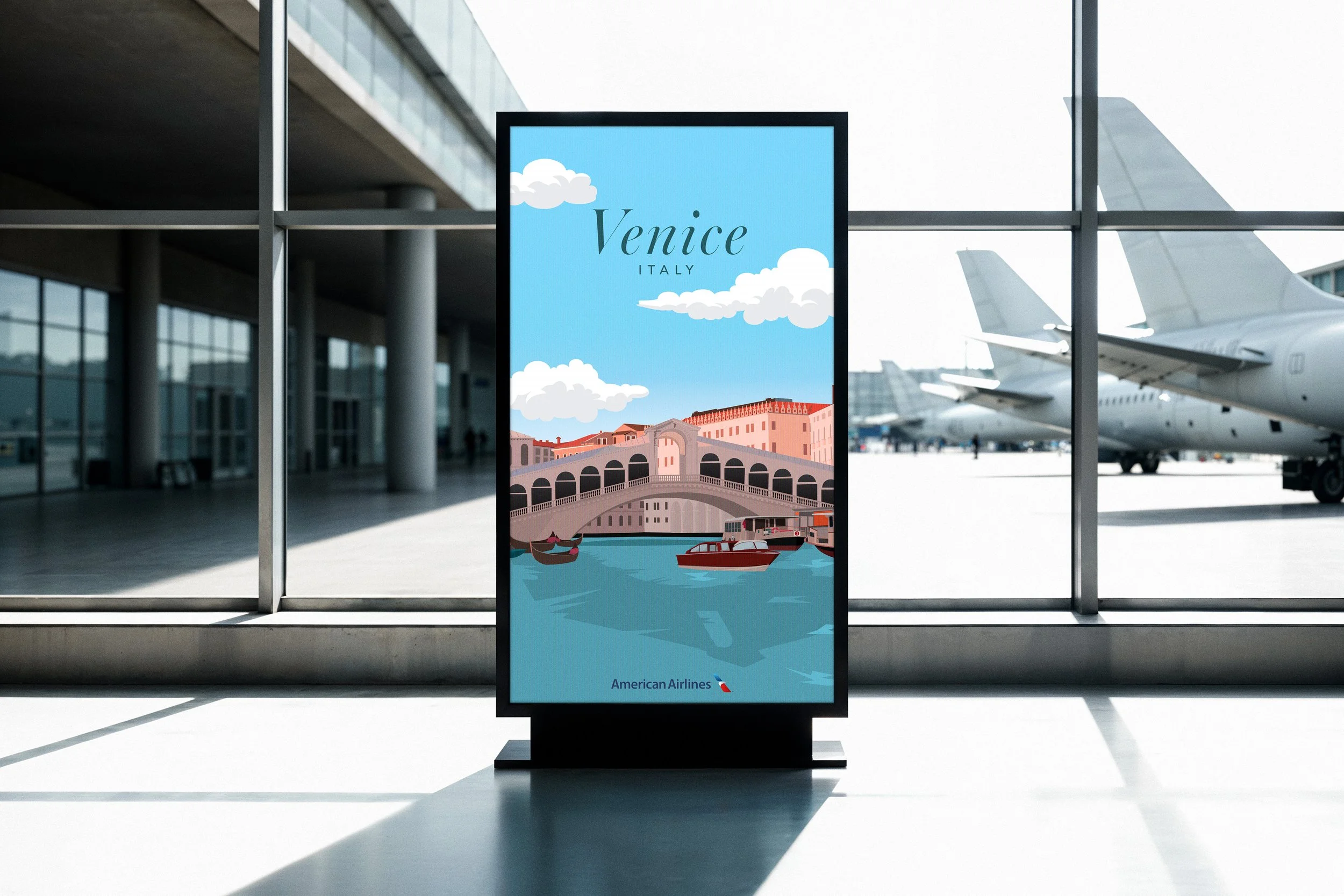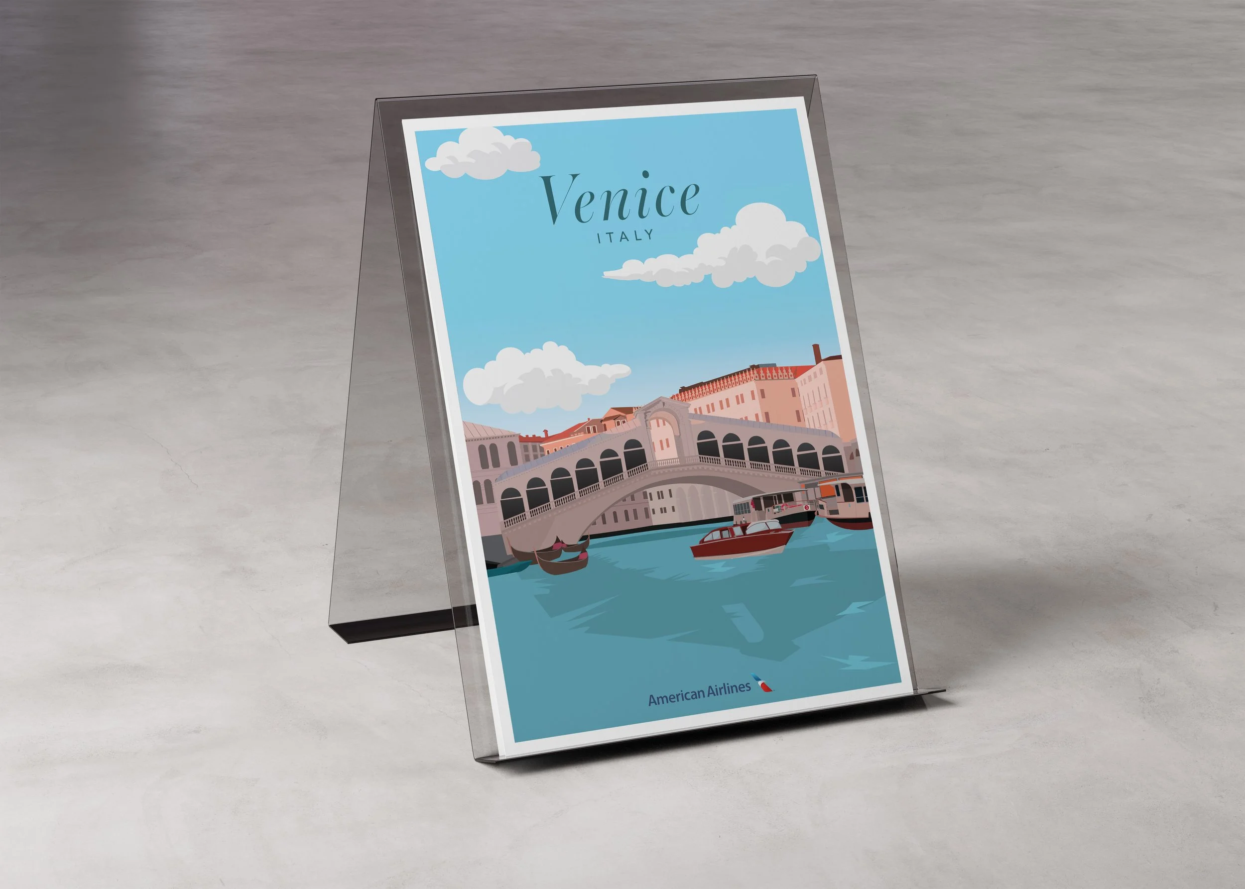 This project explores destination-based advertising through the design of a travel poster for American Airlines, focused on Venice, Italy. The goal was to create a visually engaging airport display that captures the beauty and atmosphere of Venice while encouraging travelers to imagine the experience before they even arrive.