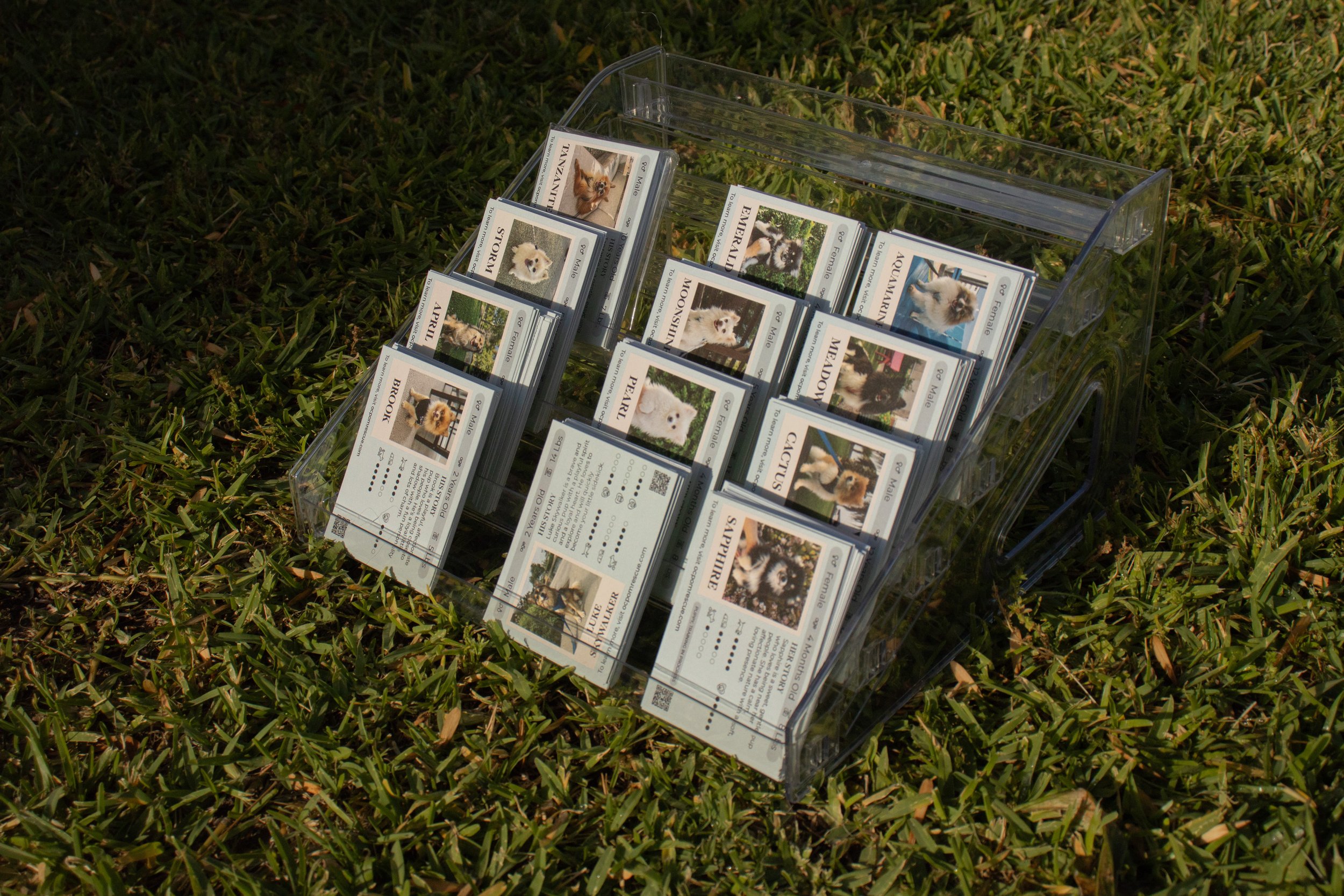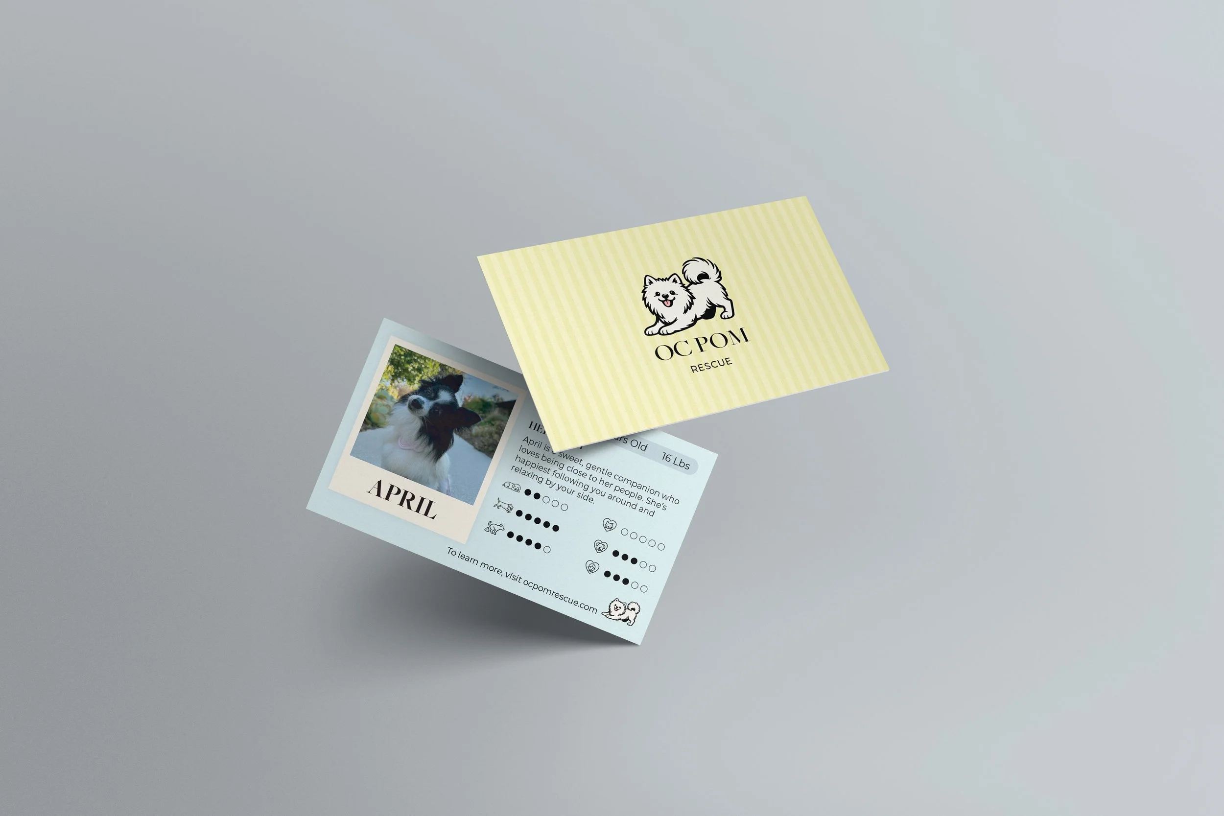 These story cards were created to help adopters learn about each dog beyond just appearance. By sharing personality, lifestyle, habits, and care needs, the cards make it easier for visitors to connect with the right Pom and feel more confident in the adoption process.